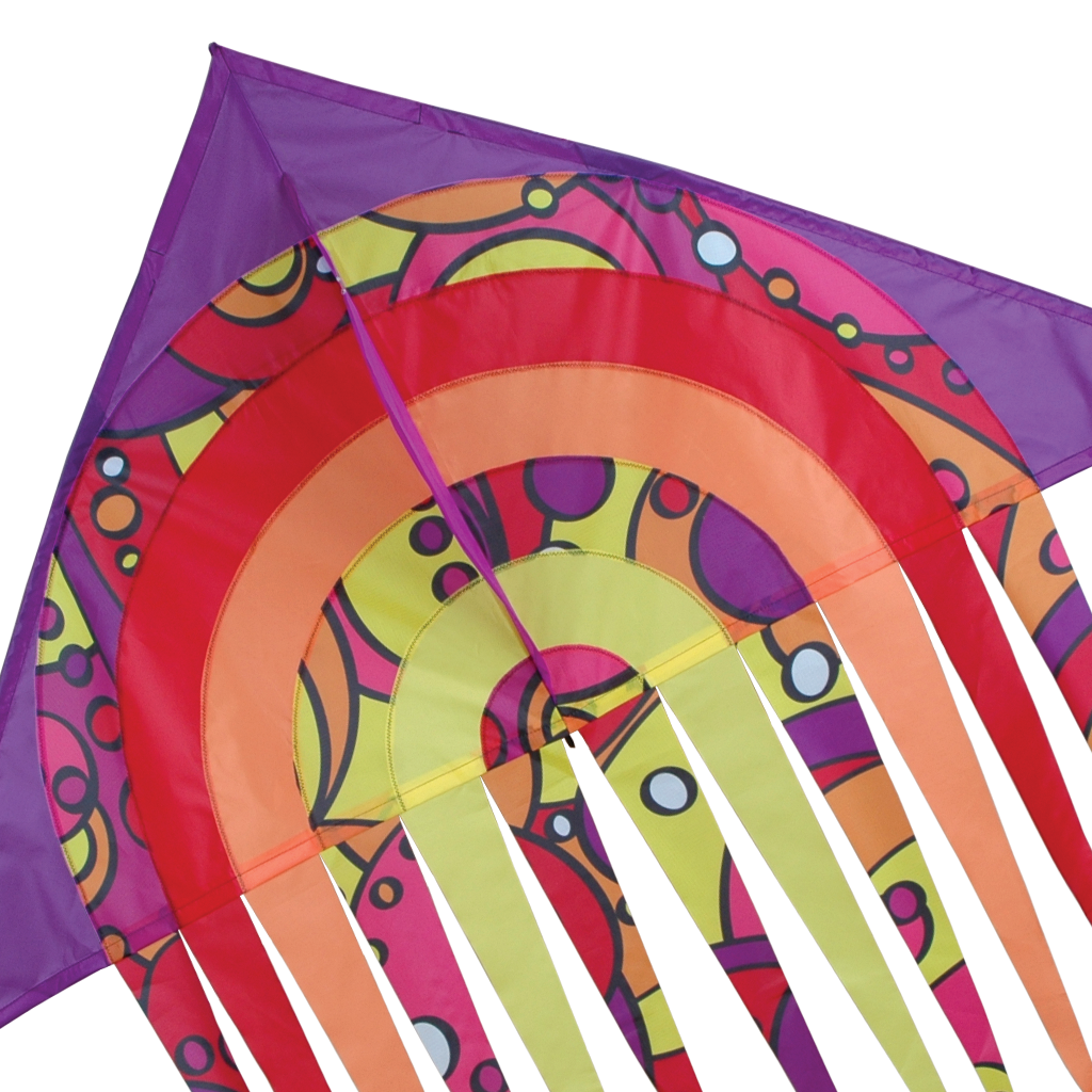 Expert kite builders know that adding fringes or tails to the trailing edge of a delta kites improve the stability of this very popular platform. The Premier 56 in. Streamer Delta has an impressive wind range, making it an excellent choice for either inland or beach flying. The classic retro graphics look great in the sky with the beautiful streams dancing in the wind. Put your rainbow to the sky!